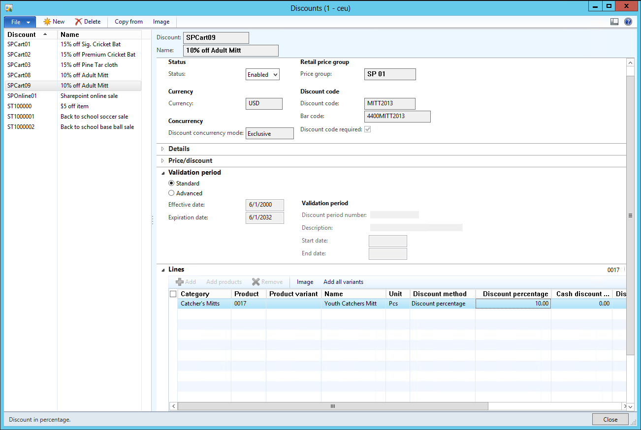 3. Set up a specific discount/coupon: Retail > Common > Pricing and Discounts > Discounts