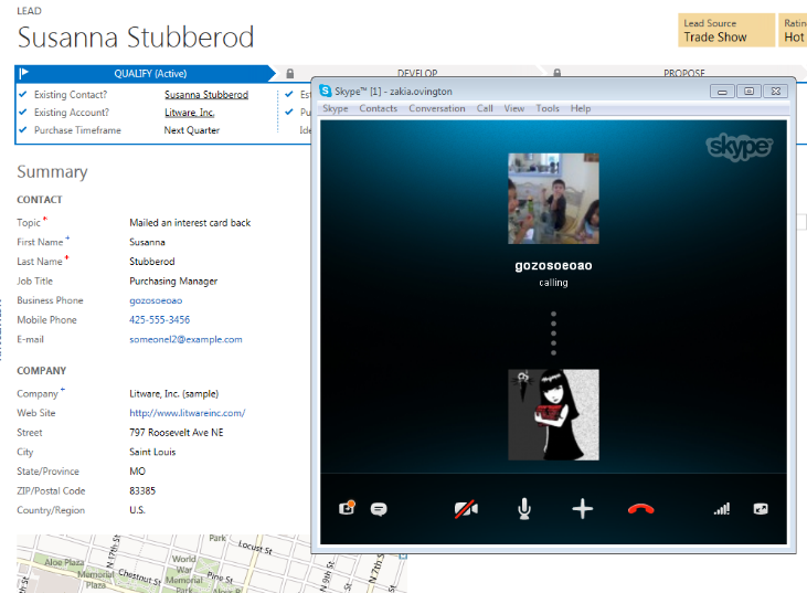 5. Skype-to-Skype calling. Trigger a Skype-to-Skype Call, if the phone number field has a Skype handle.  The phone number/Skype Name will be hyperlinked and clickable.