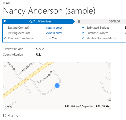 7. Bing Maps– Bing Maps are available on the Lead, Account & Contact forms. You can see exactly where on the map for directions. No more ALT TABBING! the customer is located without ever leaving Dynamics CRM. You can click on the map for directions. No more ALT TABBING!