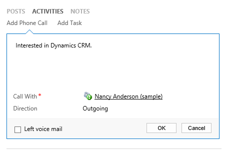 4.  Phone Call Activities are auto-created. When you click on a phone number or Skype Name, the system auto-creates a Phone activity and places the cursor on the Activity. Woo hoo! You don’t have to