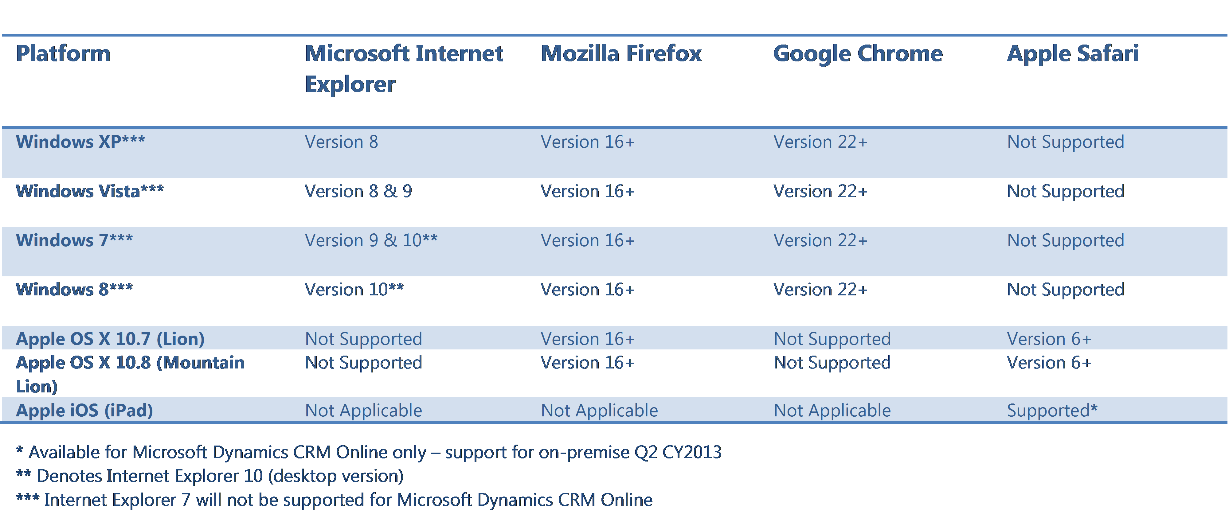 8. Cross Browser Support on Windows Devices: You can access Dynamics CRM Online org via Firefox, Chrome as well as Safari on McIntosh Desktops. Below is a list of browsers that are supported.