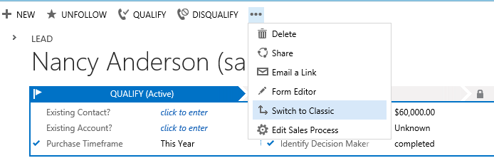 10.  Switching to Classic View: a user can switch to “Classic mode” from a menu option at the top of the form.