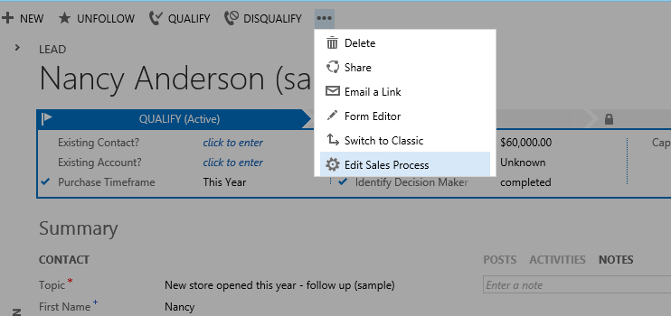 2. Easily Edit the Process Bar. The Process bar can be easily edited to meet your business process. No coding required. Just select the “Edit Sales Process” from the menu option
