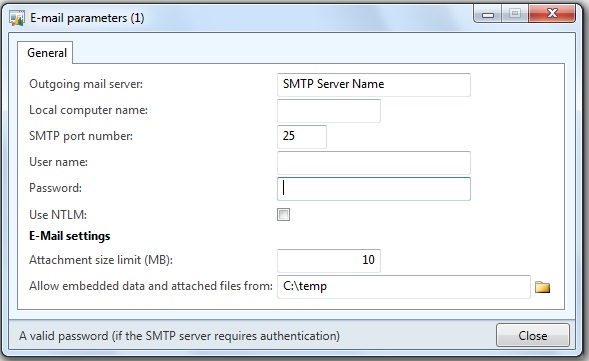 - Additional setup may need to be done in the E-mail parameters window depending on the setup of the individual environment