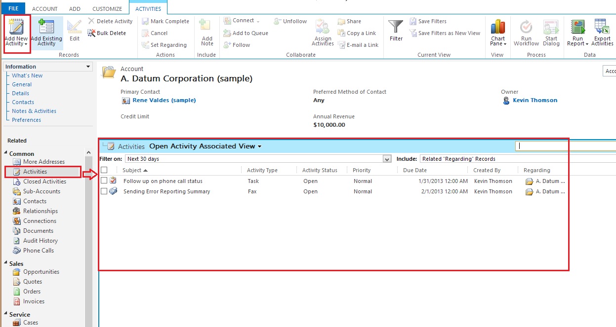 double click on account. He wants to know about all recent interactions with this account. Kevin clicks on the new Activities tab to see recent interactions with