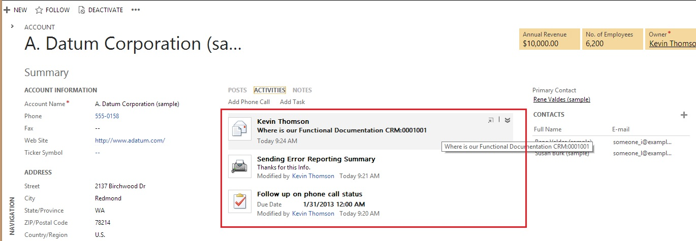 business record as a unified experience. In the CRM system, customer interactions are represented in the form of Activities i.e. Email, Phone Call, Fax, Task, appointment etc. You can see
