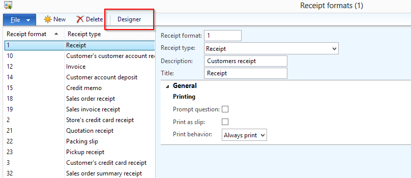 After the fields are created they can immediately be added to any receipt format. Go to Retail > Setup > POS > Receipt formats and click on the Designer button for any receipt format: