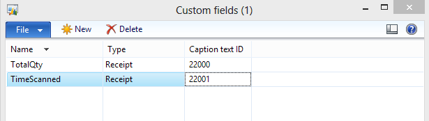 Like the custom fields for till layout, receipt fields are defined in Headquarters on the Custom Fields form (Retail > Setup > POS > Profiles > Custom fields). For our example we will create two fields, both of type Receipt: TotalQty and TimeScanned.