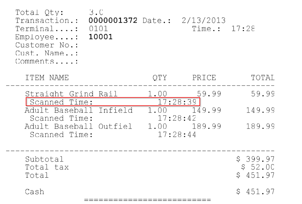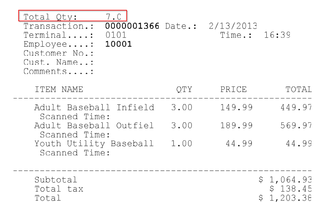 This article will show you how to add two fields to your receipt: a line item field that shows the time that an item was added to a transaction and a header field that shows the total quantity of the entire transaction (similar to what you would see on a receipt at a warehouse club retailer).
