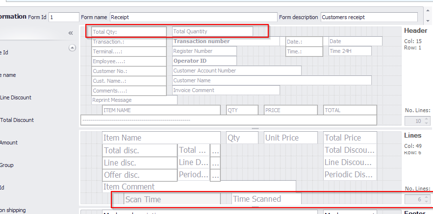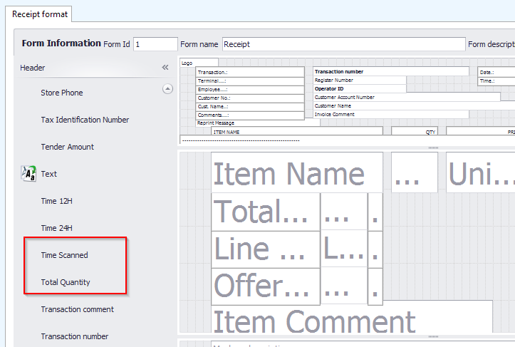 Find a place to drag the Total Quantity field onto the header section and add the Time Scanned to the lines section. Give each a hard-coded text label. Make sure to hit the Save button when you are finished (I tend to forget that step – in fact I just did so in writing up this article). Run the A-1090 or N-1090 job to push the new receipt to your POS database.