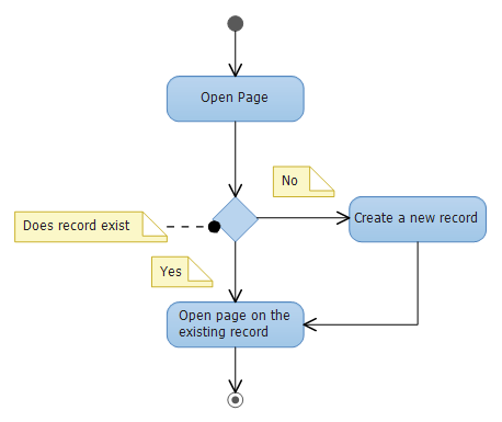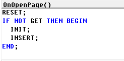 In the OnOpenPage trigger, the following code should be added to insert a record when the user opens the page for the first time, if a record does not exist already.