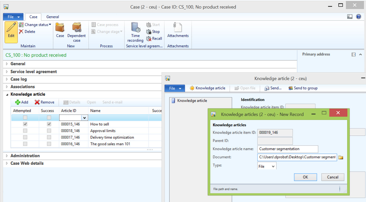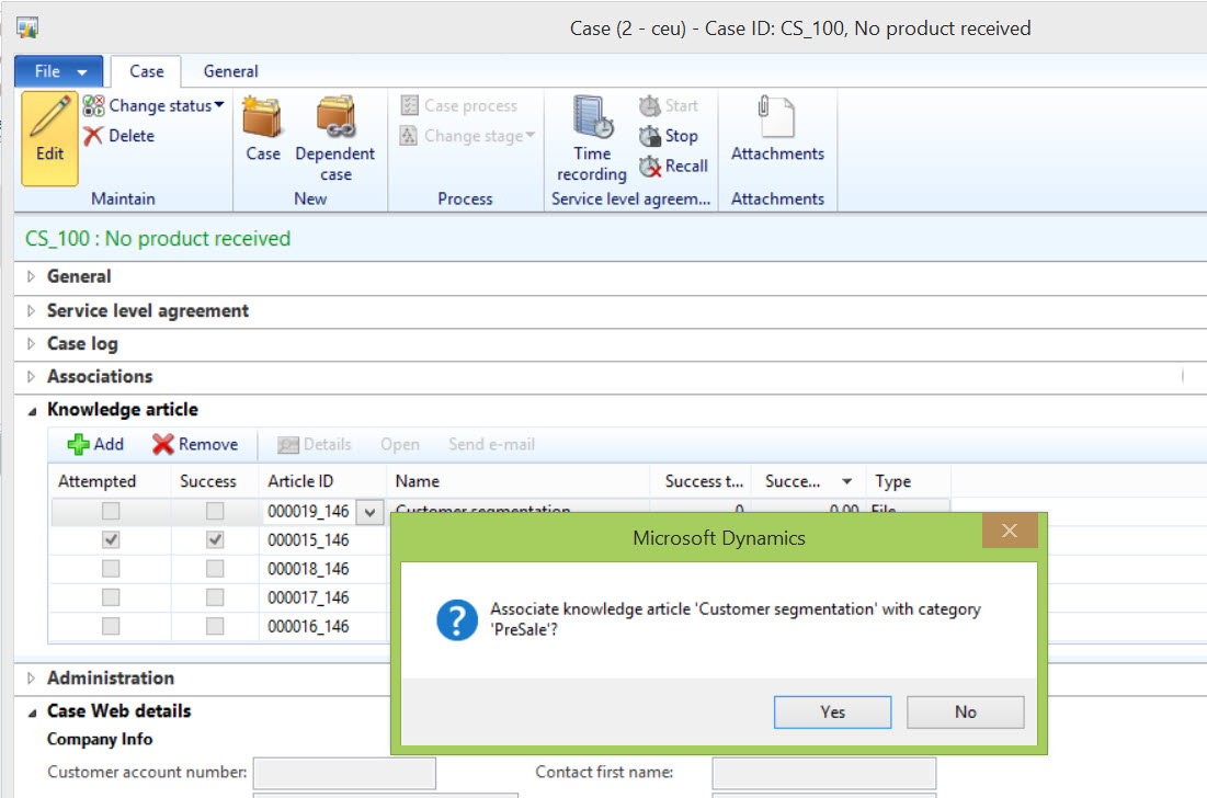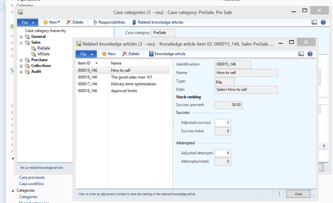 The key scenario at the time for Knowledge articles was the call between a Customer Service Representative (CSR) and a customer calling in with an issue. Combining that with a wish to accumulate structured knowledge into AX and we have the Knowledge article feature. What the CSR should see in the Knowledge article tab of the Case details form is a set of relevant documents and links to the issue faced sorted so that the most useful articles are at the top.