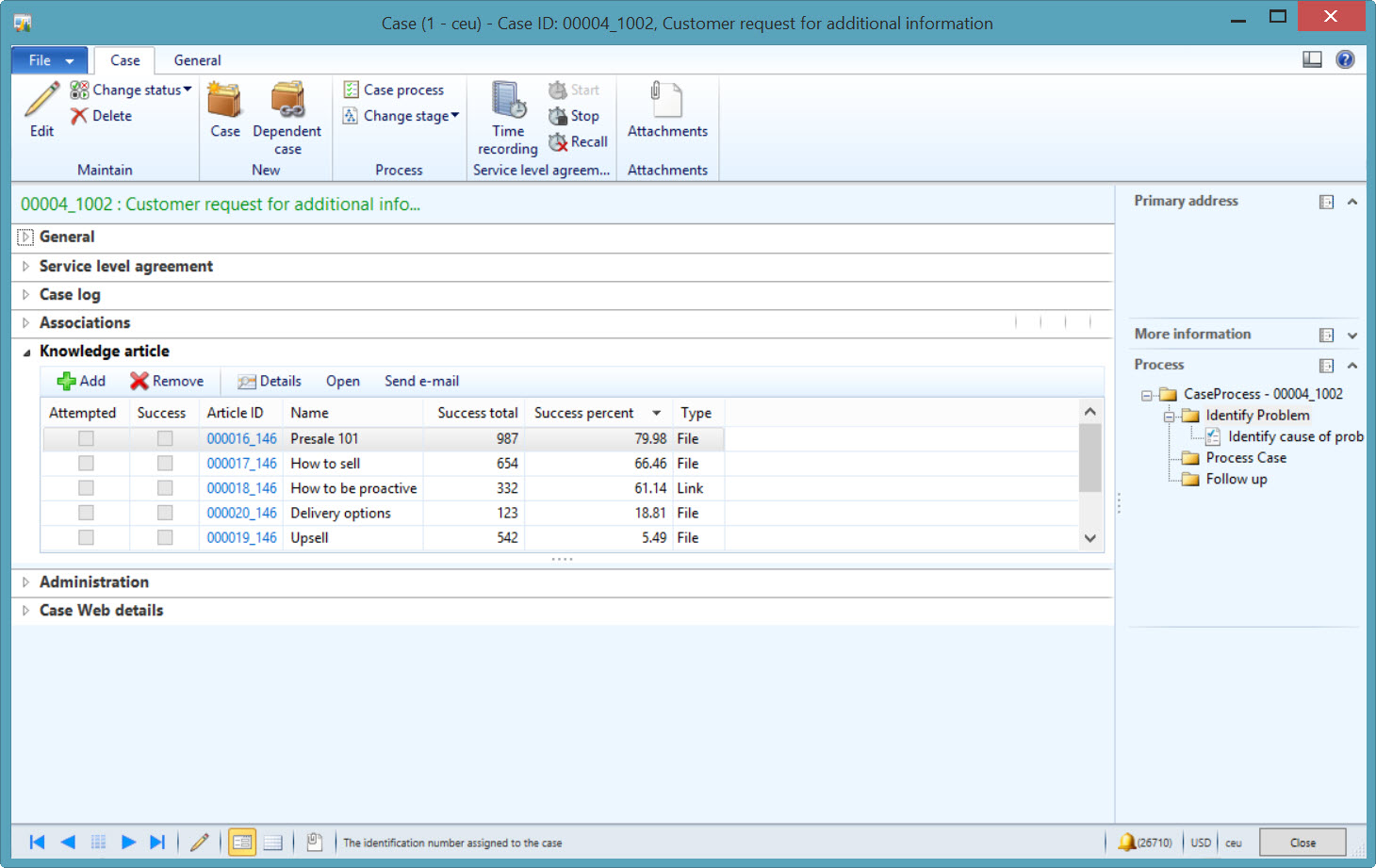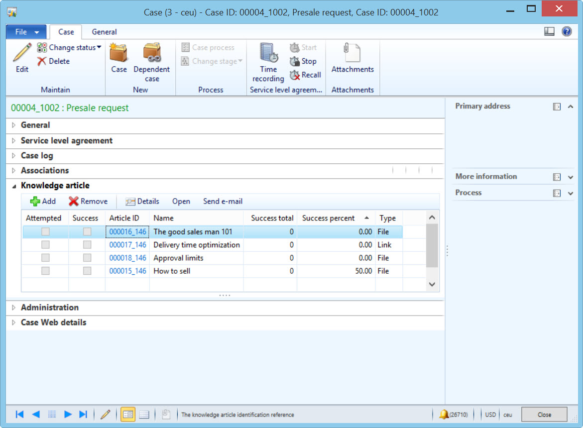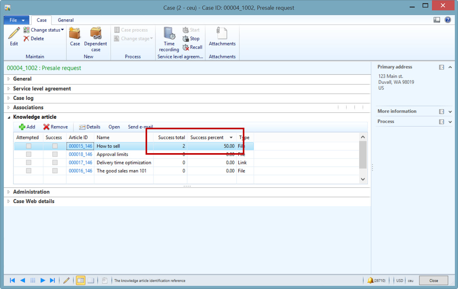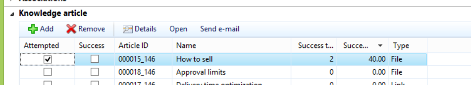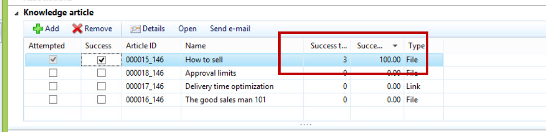 Notice how I have adjusted the “Related knowledge article” called “How to sell” in the above screenshot with 2 and 4 respectively making the success percent 50 = ((0+2)/(0+4))*100. I see that 50% again when I view the related knowledge articles in the Case details form (with the caveat that I have made a modfication to my code as noted in the end note):