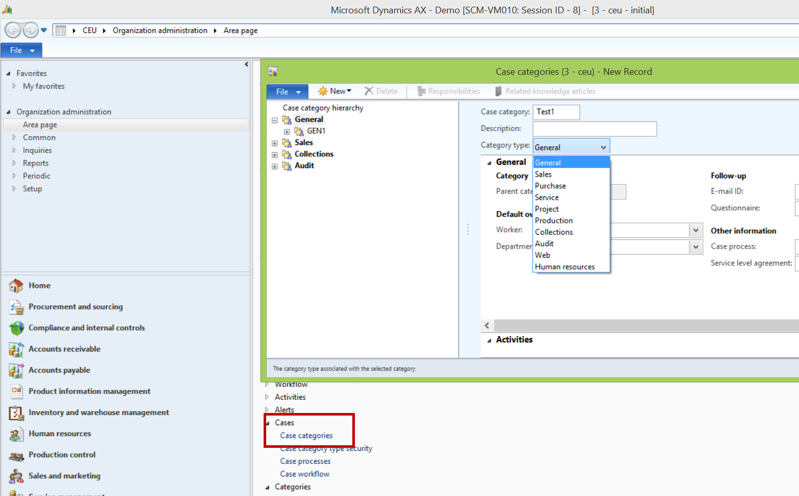 In order to make the right and relevant documents available to the user the Knowledge articles created above needs to be referenced to case category. The case category represents a logical division of cases and is further divided into category types which is tied into different application areas for example Sales, Purchase, Service etc. Cases with a category of for example Sales can be created off (among other) the Sales order and purchase off Purchase orders etc. The categories are available from the Organization administration > Setup > Cases > Case categories