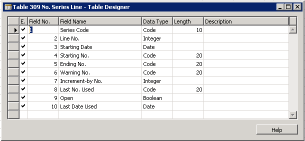 The table which will host the number from the number series, needs the following fields: