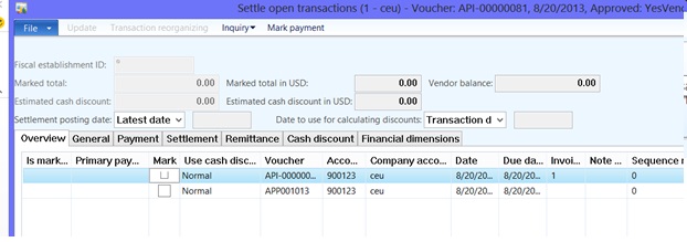 15. In the Settle Open Transactions form mark the Mark checkbox for the Payment Voucher that you are cancelling.