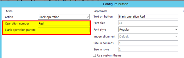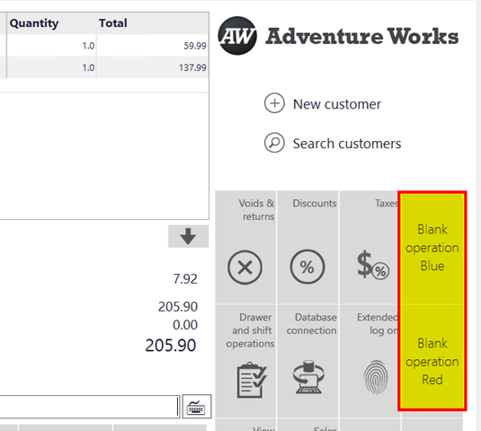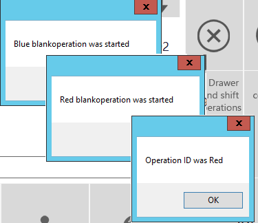 Load and build the attached MultipleBlankOps.sln to see how all of this plays out. The “Blue” Blank Operation is identical to the “Red” code shown above. Copy the resulting DLLs to the \Extensions folder of the POS and create two Blank Operation buttons: one with operation number “Red” and one with “Blue”: