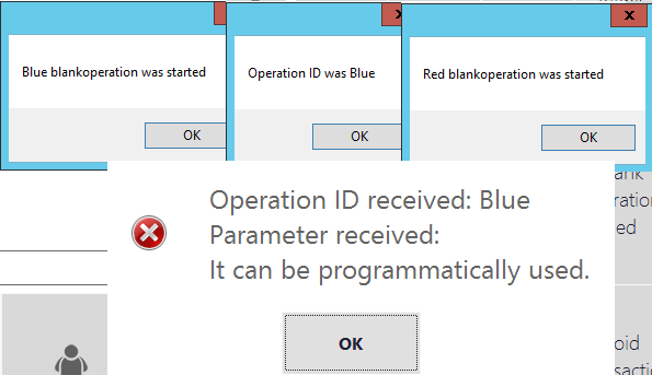 This information is passed in as operationInfo.OperationId and operationInfo.Parameter. Previously, you would use a switch statement based on OperationId to determine which branch of code would get executed. With multiple Blank Operation DLLs, the same rule applies: differentiate your logic with the same unique OperationId:
