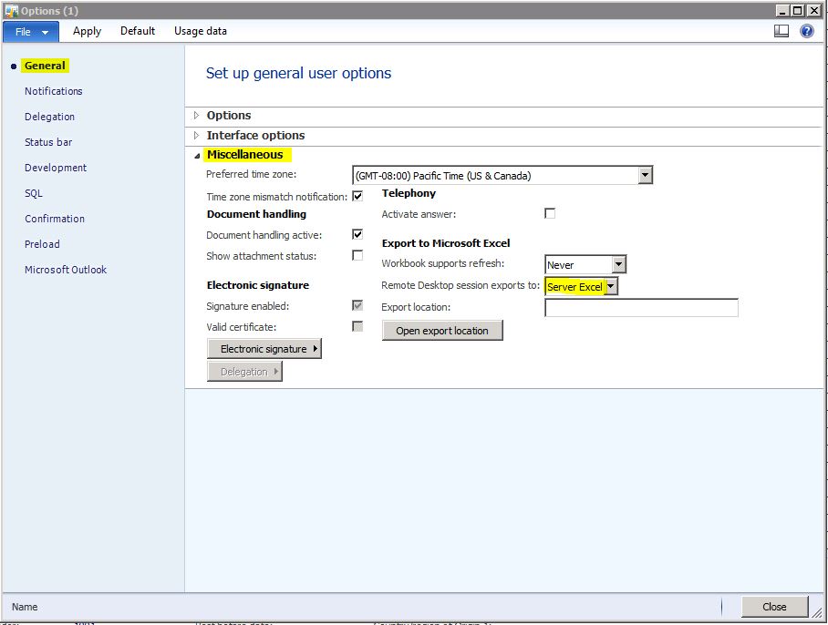2. Scroll down to the Miscellaneous fast tab and set the “Remote Desktop session exports to” value to “Server Excel”.