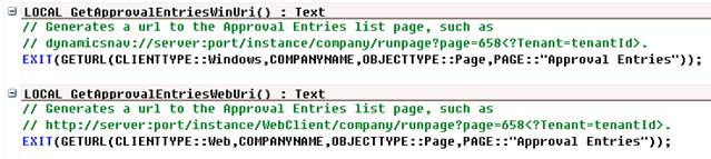 The following example shows how to use the GETURL function in codeunit 440 to ensure that the notification mail in Document Approvals can link to both the Microsoft Dynamics NAV Windows client and the Microsoft Dynamics NAV web client: