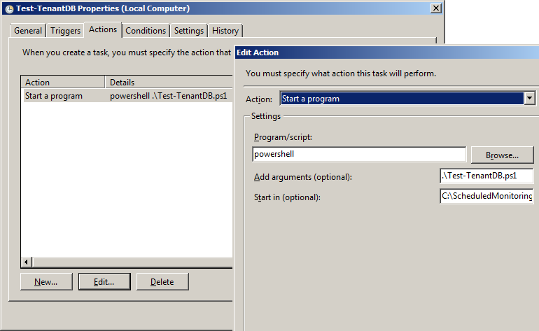 The task expects a working directory that is named C:\ScheduledMonitoring and contains the PowerShell script Test-TenantDB.ps1