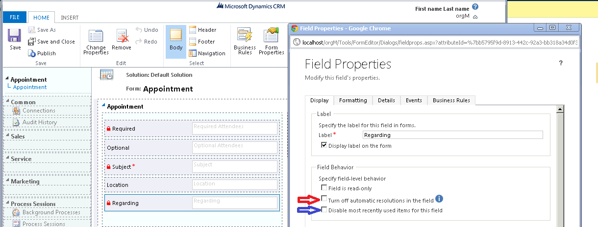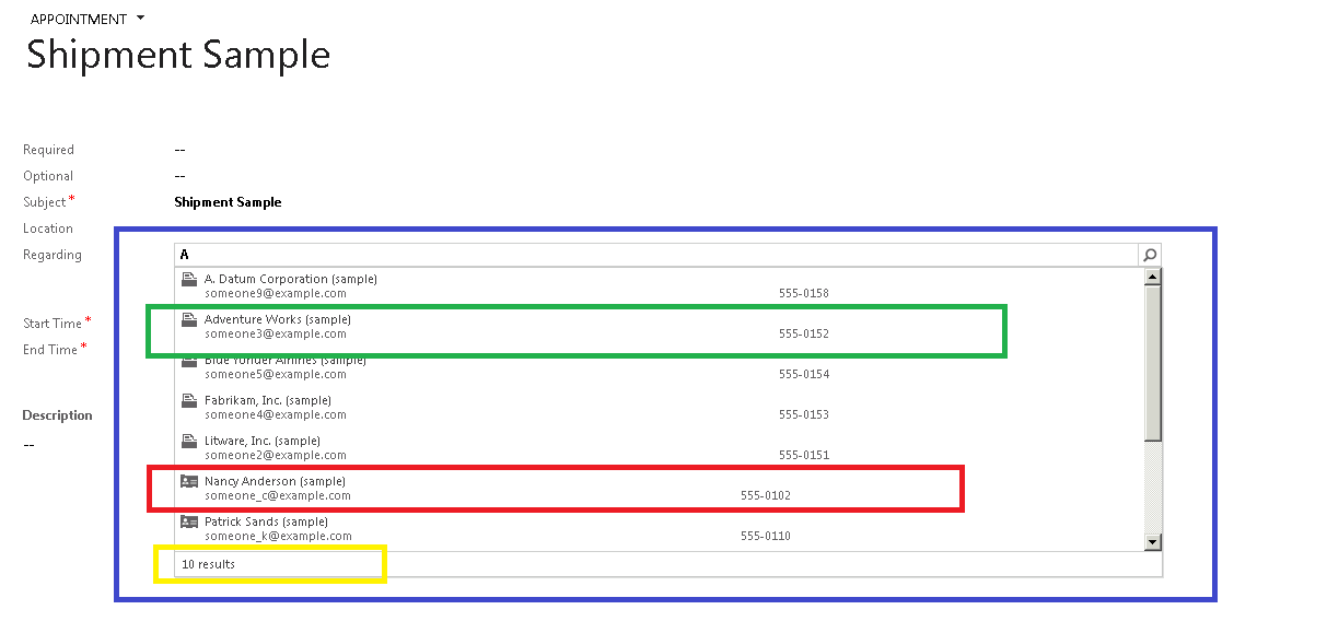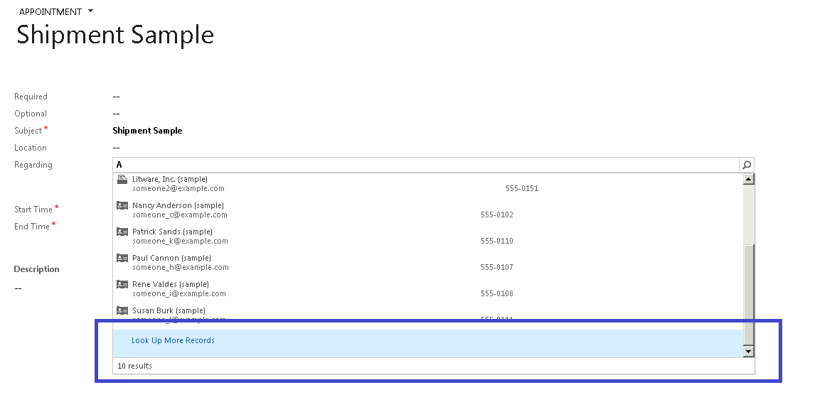 We will use the Regarding lookup field of the Appointment activity to demonstrate the inline single lookup and inline lookup menu.