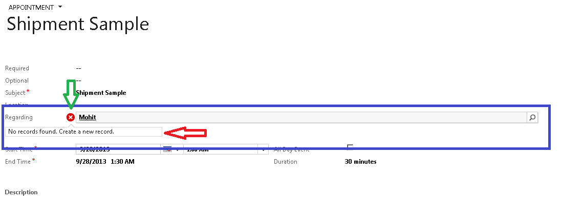 A notification icon (see the green color arrow) will be displayed beside lookup control and on hovering over this icon, a message stating “No records found. Create a new record.” will be displayed.