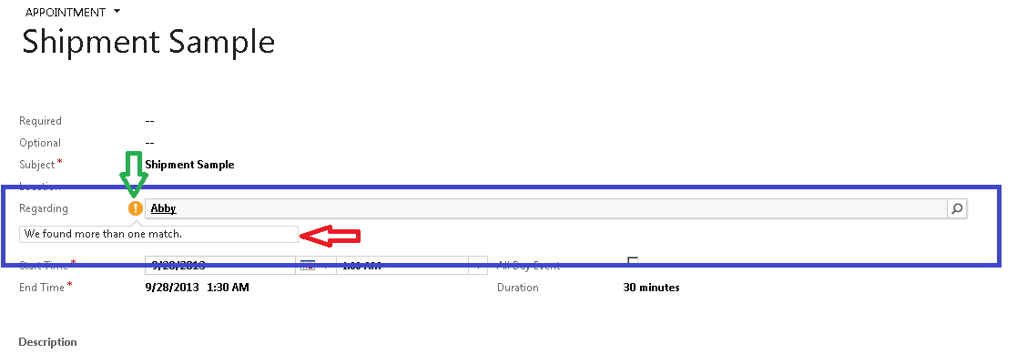 1. Navigate to Activities’ home page gird and create a new Appointment. Click on the “Regarding” field. This shows you the familiar single lookup with search icon. It is highlighted in below snapshot.