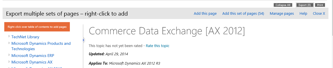 I’ll walk through a couple examples: creating a PDF of the Retail Commerce Data Exchange content, and creating a PDF on Master Data Management, which will include all of the AX 2012 R3 content about master data management, some SQL Server content about Master data services, and some AX 2012 R3 content about the Data Import/Export Framework. You can follow the same procedures, but substitute any content that meets your needs.