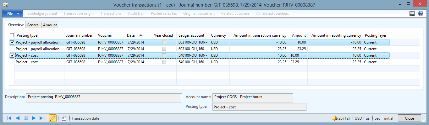 When we look at the voucher for the hours journal, we can see the indirect cost posted for the $10 amount: