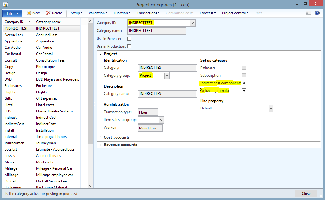 - Next, we’ll need to set up the project category. To link the project category with the newly created shared category, go to Project management and accounting | Setup | Categories | Project categories. Click “New”, and select shared category we just created for the “Category ID”. Select the “Category group” that contains the posting setup for this project category. Check the box for “Indirect cost component”, and “Active in journals”. Close the form.