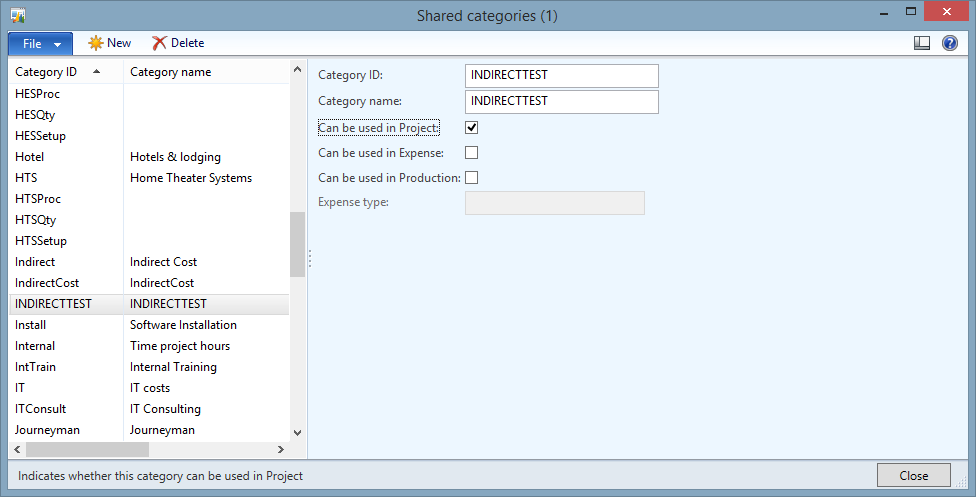 - First, we’ll need to set up the indirect cost shared category. Go to Project management and accounting | Setup | Categories | Shared categories. Click “New”, and enter a “Category ID” and “Category” name. Check the box for “Can be used in Project”. Close the form.