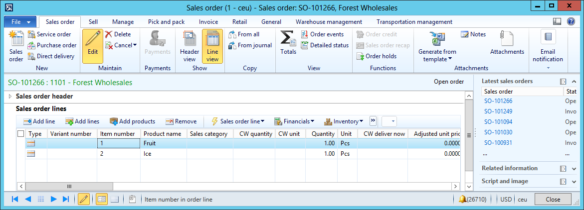 We have created a sales order for fruit and ice.
