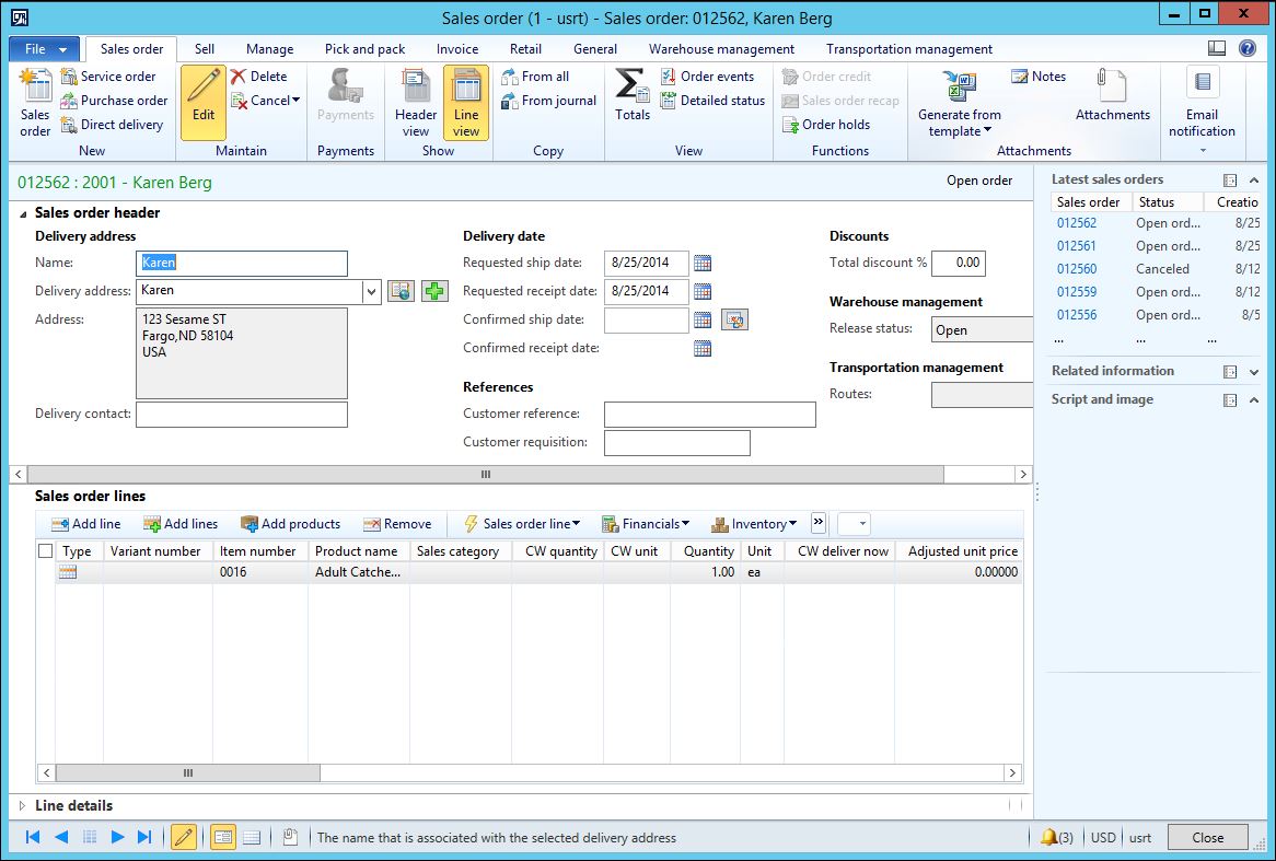 When these features are selected and a Call center channel user creates a sales order, the sales order form will display different buttons and fields as seen below with a few highlights of the newly available options: