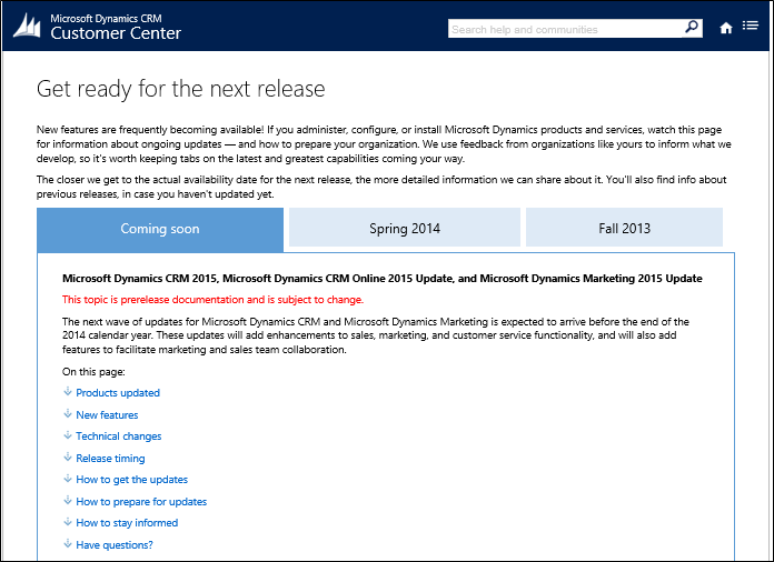 The Get ready page also covers release timing and tells you how to prepare for and get updates. You’ll also find information on the Spring 2014 and Fall 2013 updates if you’re updating from earlier on-prem versions.