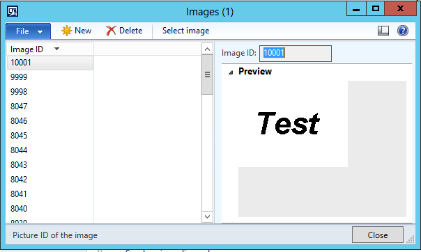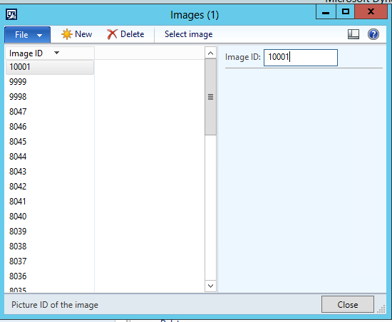 Click New to create a new image and enter a value for Image ID.  Once the ID is set click the Select Image button and load the image from your file system.  This will then insert the image into the RetailImages table in the AX Database.   You will also see a preview of the logo: