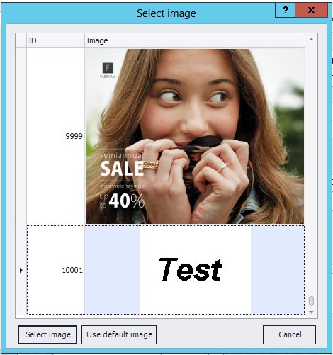 This will bring up the Select Image form.  Select the ID of the logo you want to use on this receipt and click Select Image.  For this example select the image that was uploaded earlier (10001):