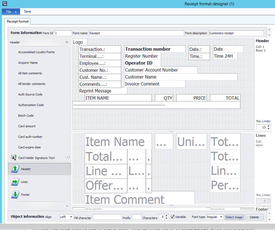 AX for Retail 2012 R3 introduced a new feature on the Receipt Format Designer that allows you to select a specific image for your Receipt Logo.   In previous versions of AX for Retail you had to place a specific logo file on each terminal, either as a local bitmap on the file system or directly into the printer’s memory.  This made for a lot of effort if you ever wanted to change the logo on your printed receipt.  The new functionality now allows you to centrally manage your receipt images directly from Headquarters, and even provides the ability to have multiple logos on the same receipt.