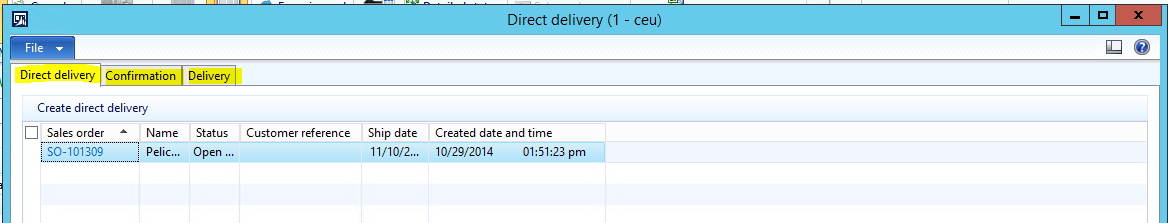 - The Direct Delivery tab shows all Sales Orders that have lines that are marked for Direct Delivery but do not have a Purchase Order created for them yet.