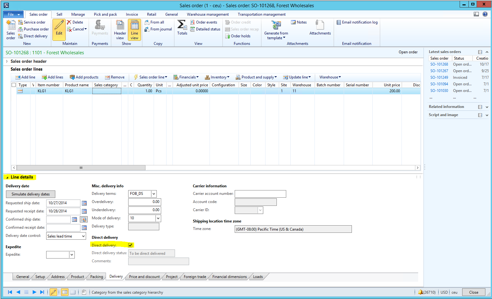2. Enter line for Direct Delivery Product or set line to be Direct Delivery in Delivery Tab of Line Details and then Save the SO