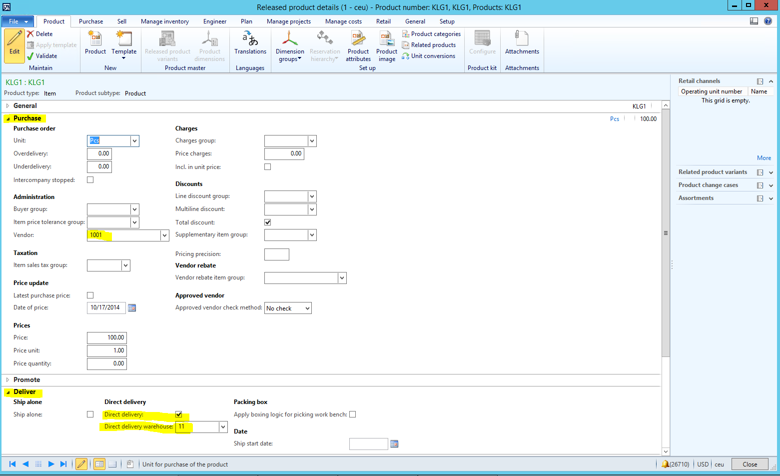 Direct Delivery Journals form (Procurement and Sourcing | Journals | Direct Delivery):