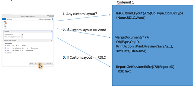 The report execution calls the HASCUSTOMLAYOUT function in codeunit 1 to determine whether the particular report is currently set up to use a custom RDLC or custom Word layout.If the report does not use a custom layout (that is, the function result is 0), then the report will use the default built-in layout, which can be either RDLC or Word as specified by the DefaultLayout property of the report object.Note: This is function is called before the request page is shown to the user because some of the Print button options on the request page depend on whether the report uses and RDLC layout or Word layout.