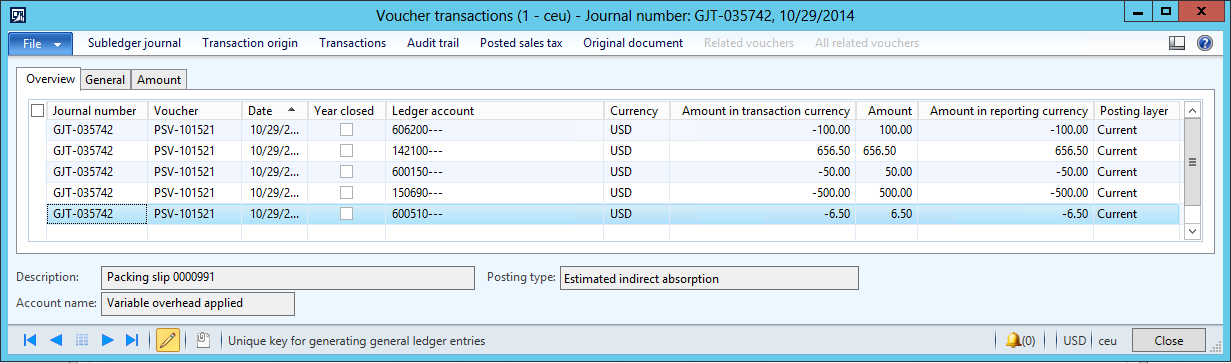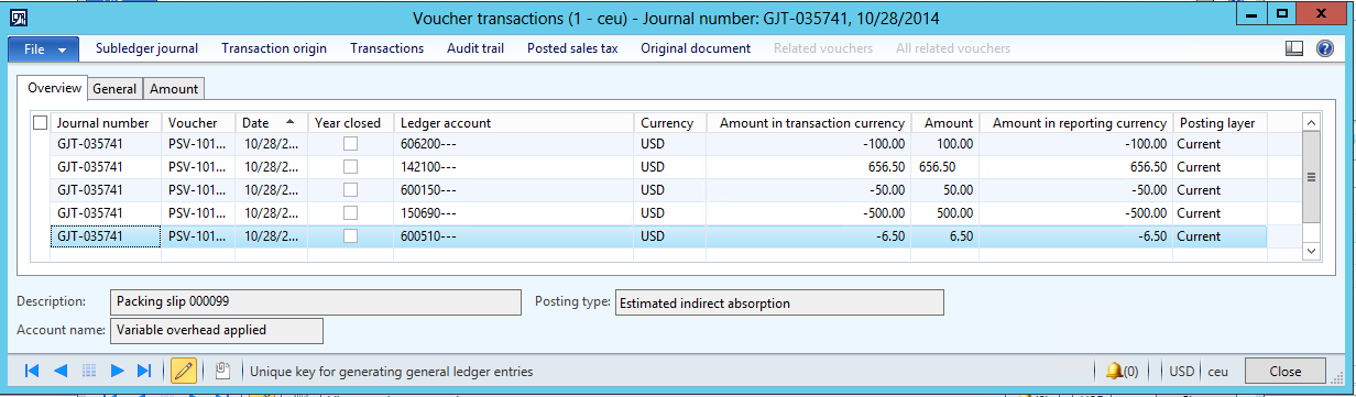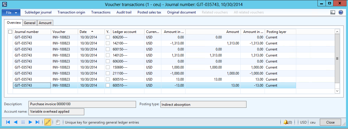 Note: You will see a few 0.00 postings in the voucher. These are related to a current limitation in posting engine and will be addressed at a later time. The postings are not effecting any balances in General ledger.