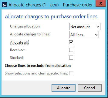 | Proportional * | (Purchase order line applicable charge value / ordered quantity) * Received quantity | (Received quantity / Ordered quantity) * “PO line proportional Value” |