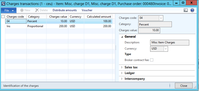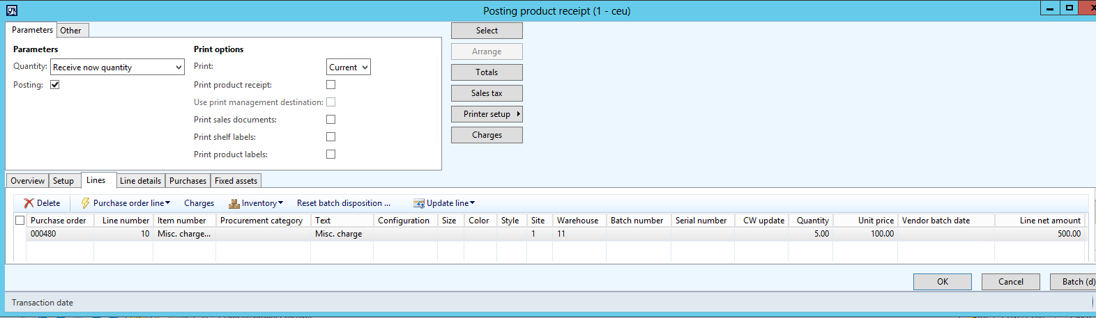 Note: If you want to account for Misc. charges at time of posting product receipt and has checked marked “Generate charges on product receipt” you must as minimum also check mark “Post physical inventory” and “Post product reciept in ledger”