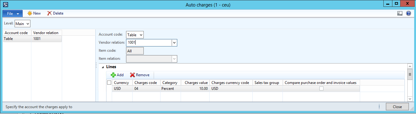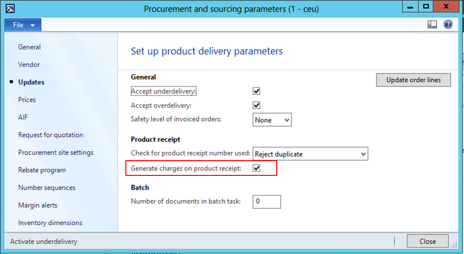 | Procurement and sourcing/Procurement and sourcing parameters | Generate charges on product reciept | Yes |