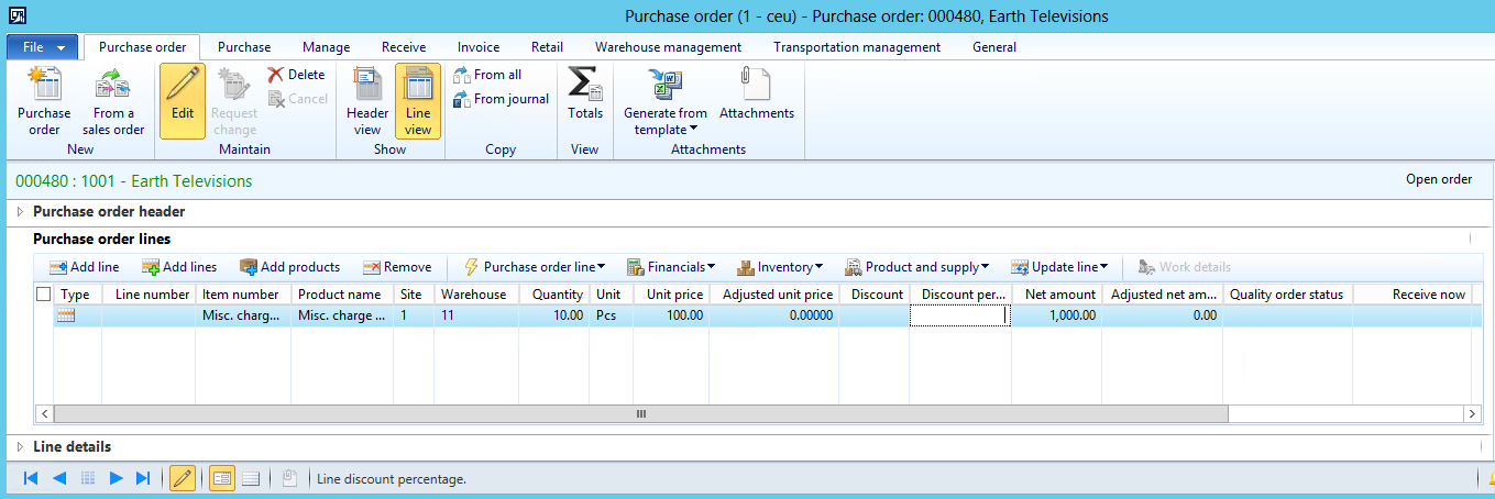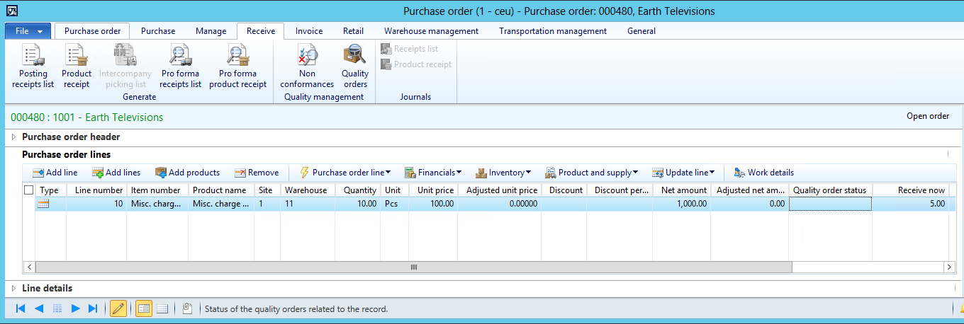 1. A purchase order of 10 pcs. is created. The unit cost is agreed at 100.00