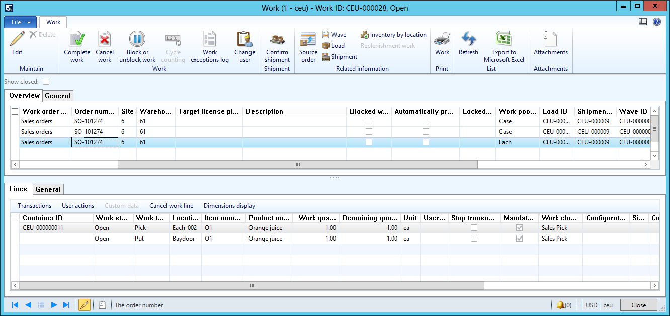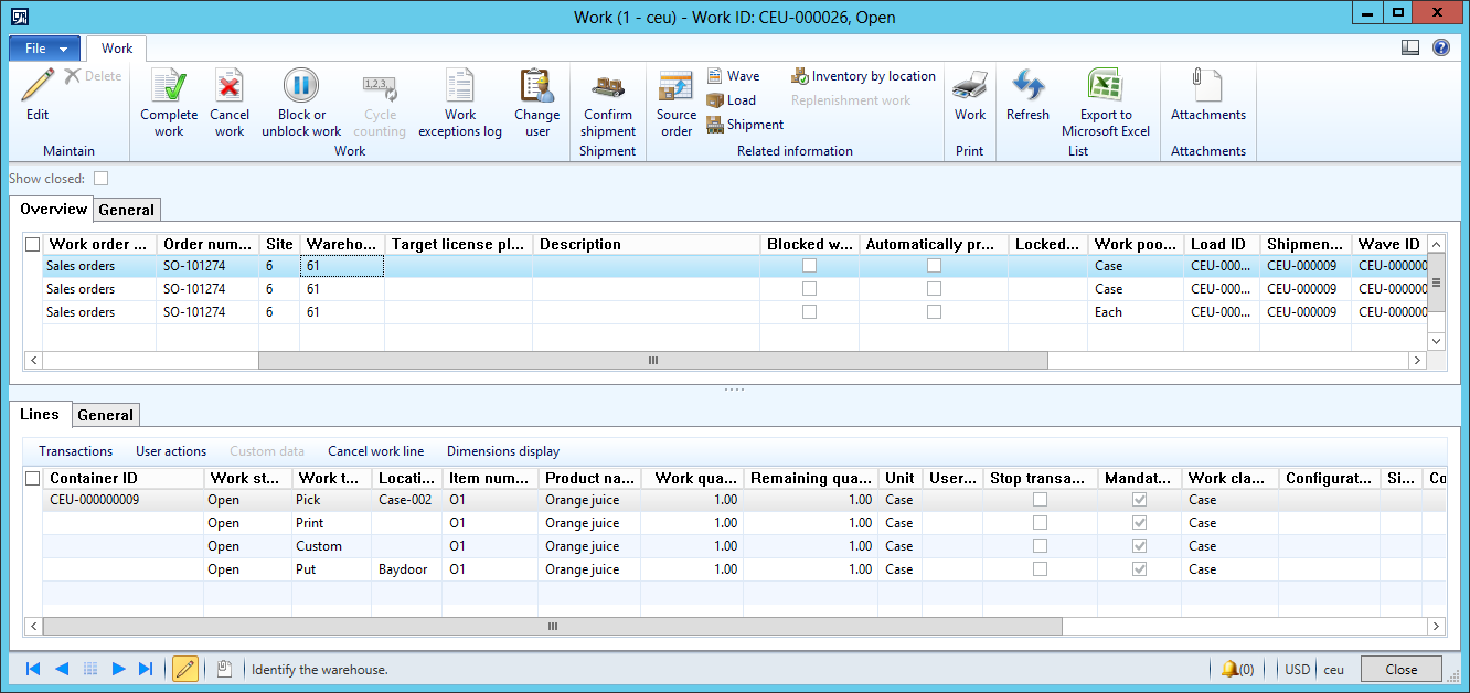 In principle, the work order for the piece picking area will need to be performed as well, but it is not relevant for this example.