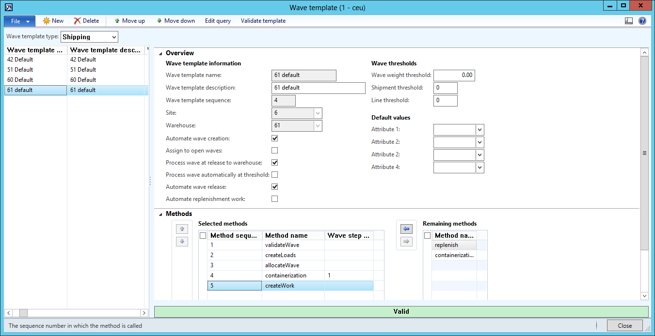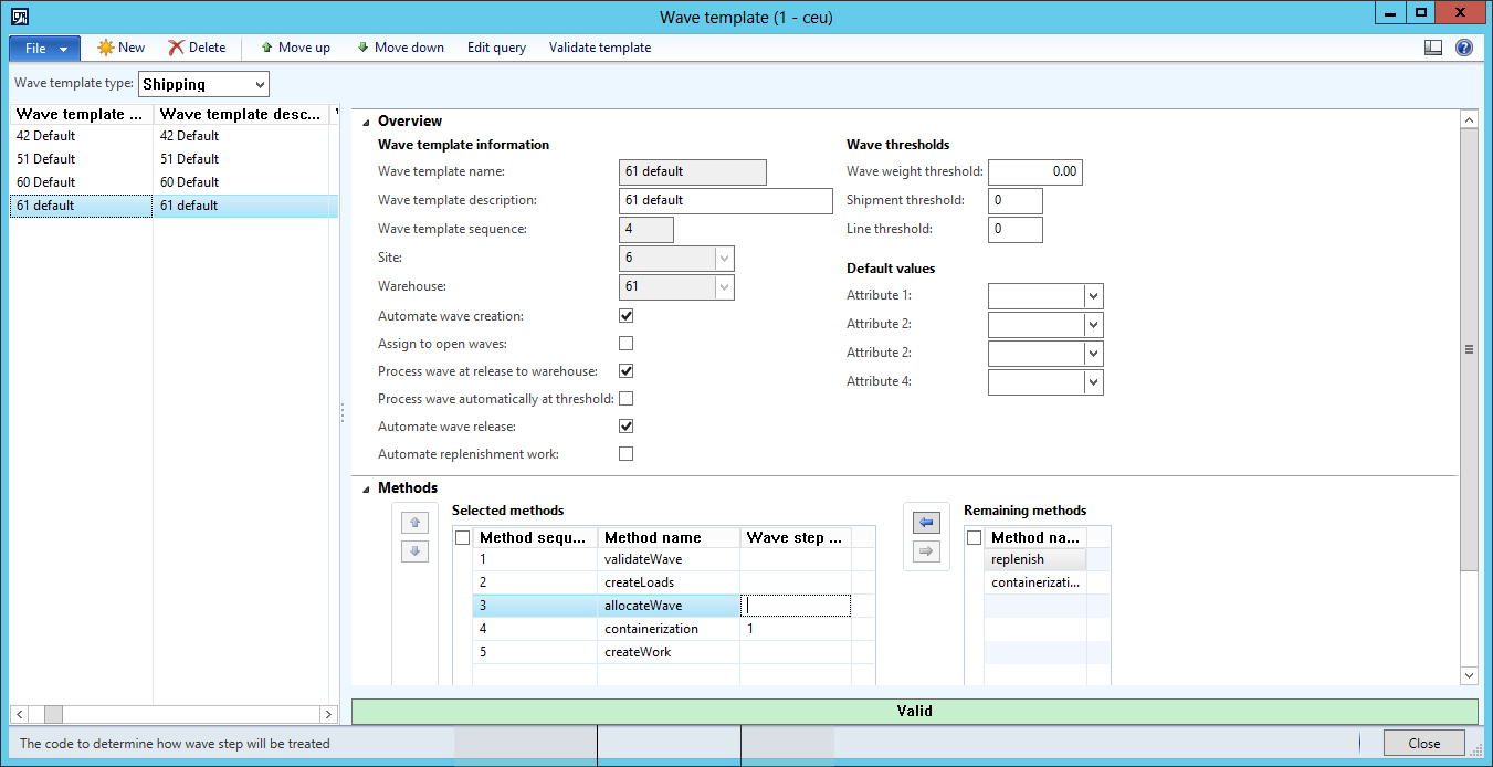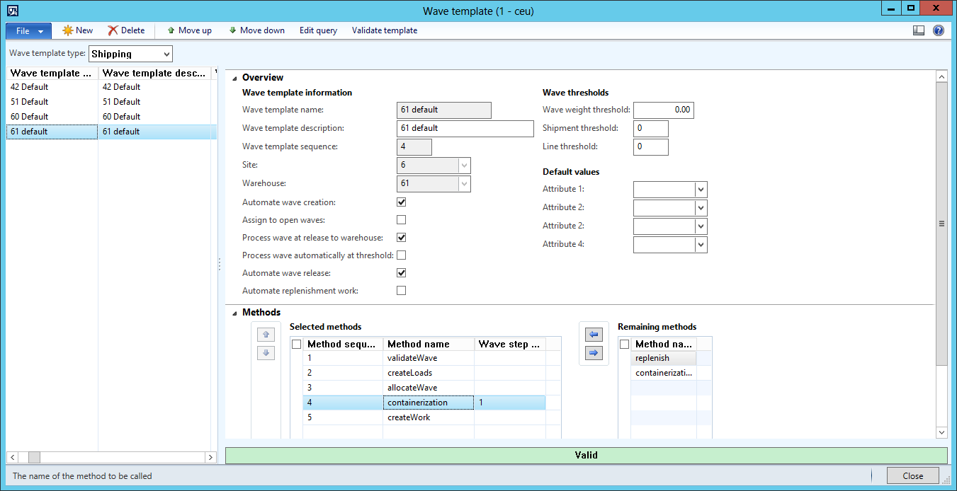 The wave method containerization is an optional method that you can add to the wave template. The value in the Wave step code field connects this method with one or more container build templates.