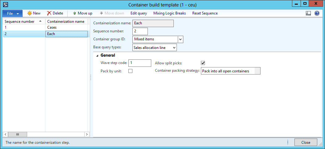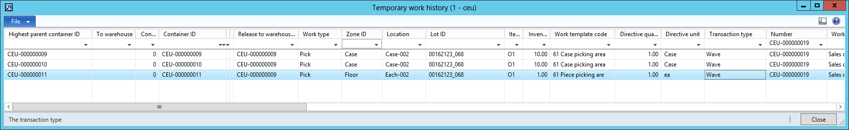 This steps described in this blog use the content of the Directive unit (DirectiveUOM) and Directive quantity (DirectiveQty) fields in the Temporary work transactions (WHSTmpWorkLine) table to create a container (WHSContainerTable) per quantity 1 of the Directive unit.